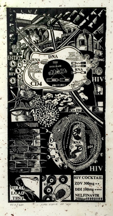 This 3' x 6' lino cut was wallpapered onto the clinic in Art As Medicine/Medicine As Art. It shows the lifecycle of HIV as it enters a lymphocyte. This is further explained in "Pictures That Give Hope".