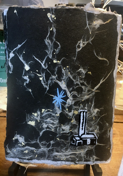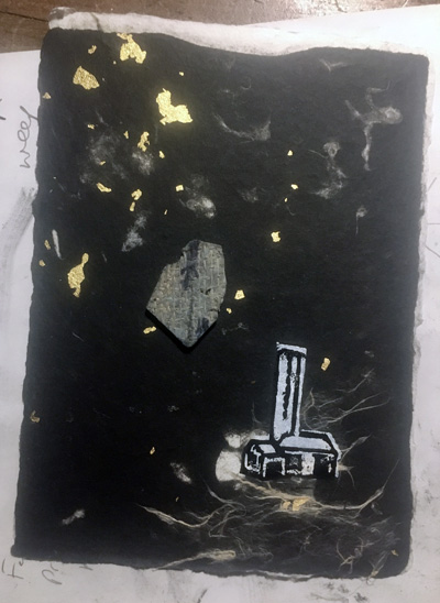 Printed great conjunction of Jupiter and Saturn on artist made paper card. Card is three layers. Kozo on pigmented abacca/cotton.